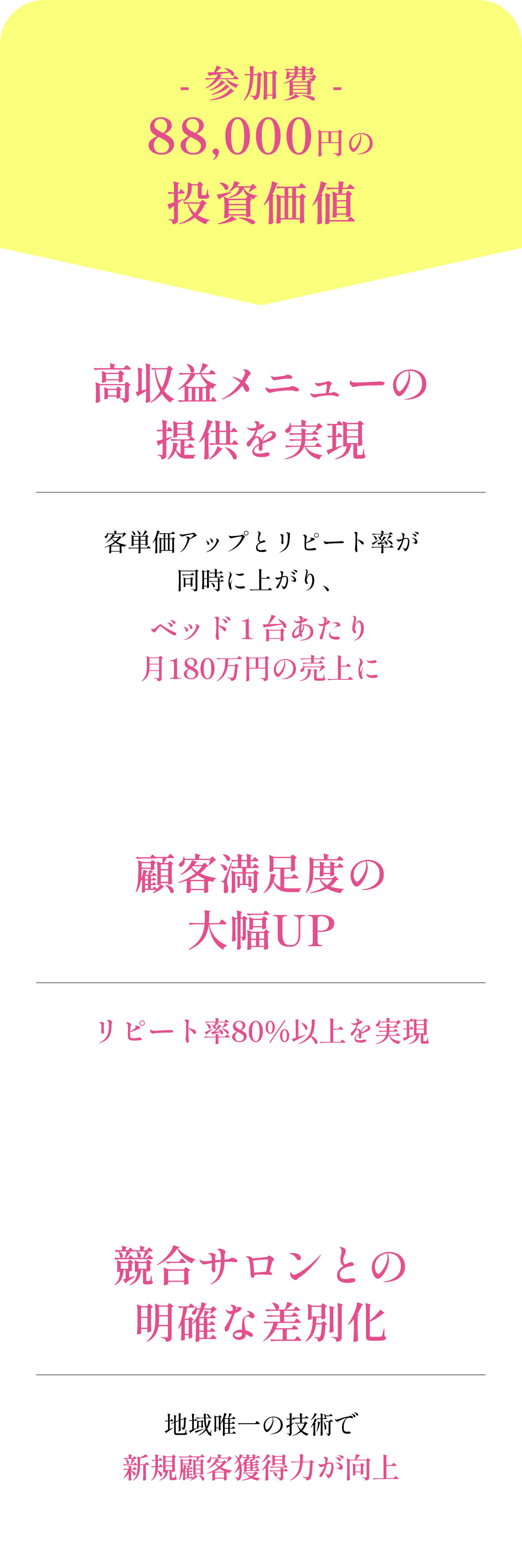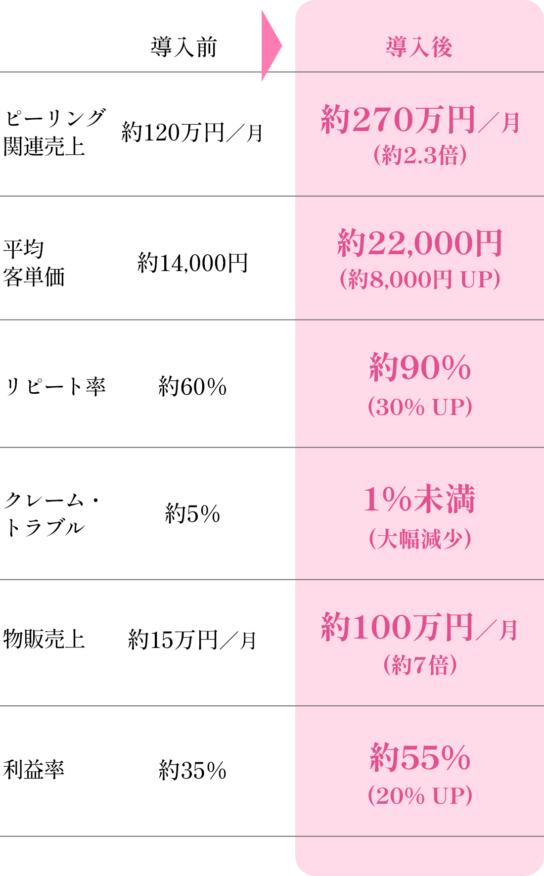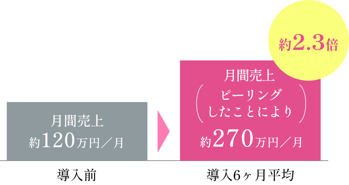 導入から3ヶ月で月売上が70万円アップしました。高単価でもお客様の満足度が非常に高く、口コミで新規のお客様も増えています。